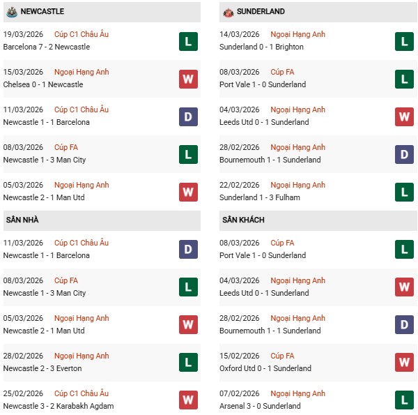 - Newcastle thắng 1, hòa 2, thua 7 trong 10 trận gặp Sunderland gần đây.