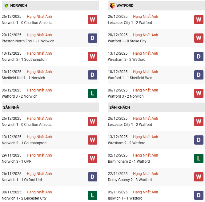 Lịch sử đối đầu cho thấy Watford chiếm ưu thế nhẹ, với chiến thắng gần nhất trước Norwich. Điều này mang lại lợi thế tâm lý rõ rệt cho đội khách, đặc biệt khi Norwich đang có xu hướng thi đấu cẩn trọng và không quá bùng nổ.