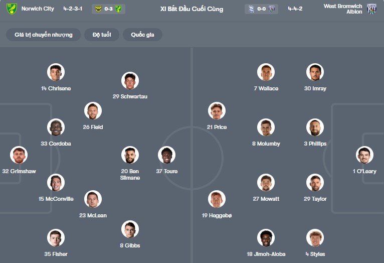 Norwich: Amankwah, Crnac, Forsyth, Amass, Schupp, Mahovo, Jurasek, Topic, Mattsson chấn thương.