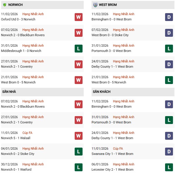 Thực tế trước khi khép lại năm 2025, Norwich thậm chí còn đang tệ hơn West Brom. Tuy nhiên phong độ của The Canaries trong năm 2026 đang hết sức ấn tượng: thắng đến 7/9 trận đã chơi. Ngược lại, West Brom có đúng 1 khúc khải hoàn từ đầu năm 2026 tới giờ, tại chính đấu trường FA Cup nhưng là sau loạt luân phiên 11m (thua 5/9).