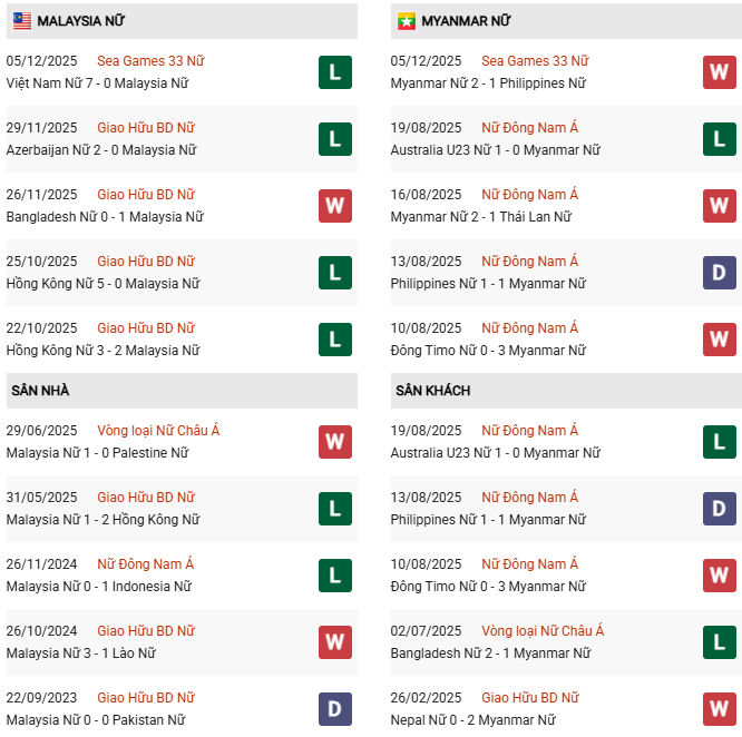 - Nữ Malaysia toàn thua trong 10 trận gặp Nữ Myanmar gần đây.