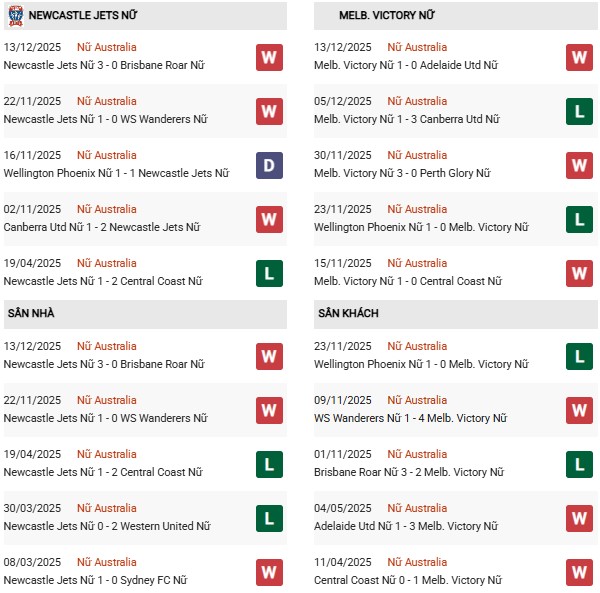 Ở chiều ngược lại, Nữ Melbourne Victory đang dẫn đầu bảng xếp hạng với 12 điểm sau 7 vòng, hơn đội nhì bảng Canberra 2 điểm và cũng hơn chính Newcastle Jets 2 điểm. Dù đã thi đấu nhiều hơn đối thủ, Melbourne Victory vẫn cho thấy bản lĩnh của ứng viên vô địch khi giành 4 chiến thắng và chỉ để thua 3 trận. Phong độ tổng thể của đội khách khá ấn tượng với 6 chiến thắng, 1 trận hòa và 3 thất bại trong 10 trận gần nhất. Đặc biệt, Melbourne Victory chơi rất tốt trên sân khách khi thắng 6, hòa 2 và chỉ thua 2 trong 10 chuyến xa nhà gần đây, giúp họ tự tin hướng tới mục tiêu 3 điểm.