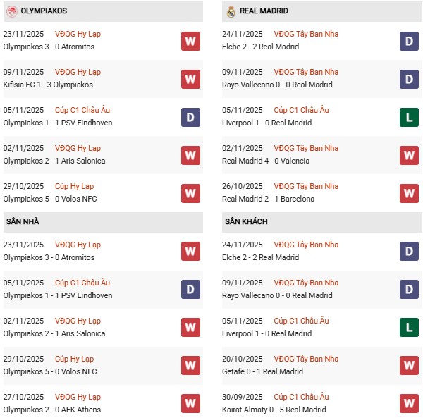 Cả 4 chiến thắng của Real Madrid trước Olympiakos đều tới trên sân nhà và đoàn quân HLV Xabi Alonso sẽ làm nên lịch sử nếu giành chiến thắng ở trận đấu này. Tuy nhiên, Los Blancos đang bước vào màn so tài này với phong độ không được tốt. Thực tế, Real Madrid đã không giành chiến thắng nào kể từ khi đánh bại Valencia (4-0) tại La Liga vào đầu tháng 11. Kể từ đó, đội bóng thủ đô đã thi đấu 3 trận trên mọi đấu trường, hòa 2 lần và thua 1 lần.