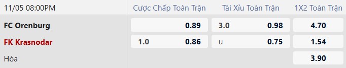 Thông tin tỷ lệ kèo Orenburg đấu với Krasnodar: