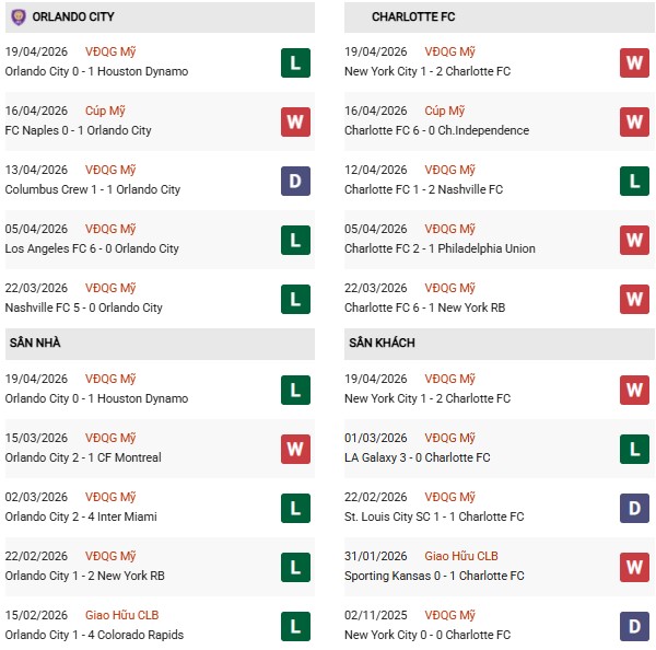 - Trên sân nhà, Orlando City thắng 4, thua 1 trước Charlotte.