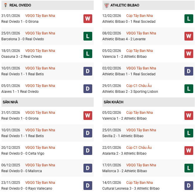 - Trên sân nhà, Oviedo hòa 1, thua 1 trước Athletic Bilbao.