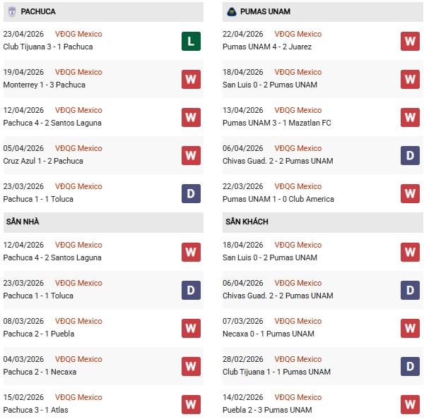 - Trên sân nhà, Pachuca thắng 4, thua 1 trước Pumas UNAM.