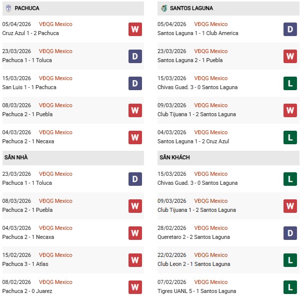 - Pachuca thắng 5, hòa 3, thua 2 trong 10 trận gặp Santos Laguna gần đây.
