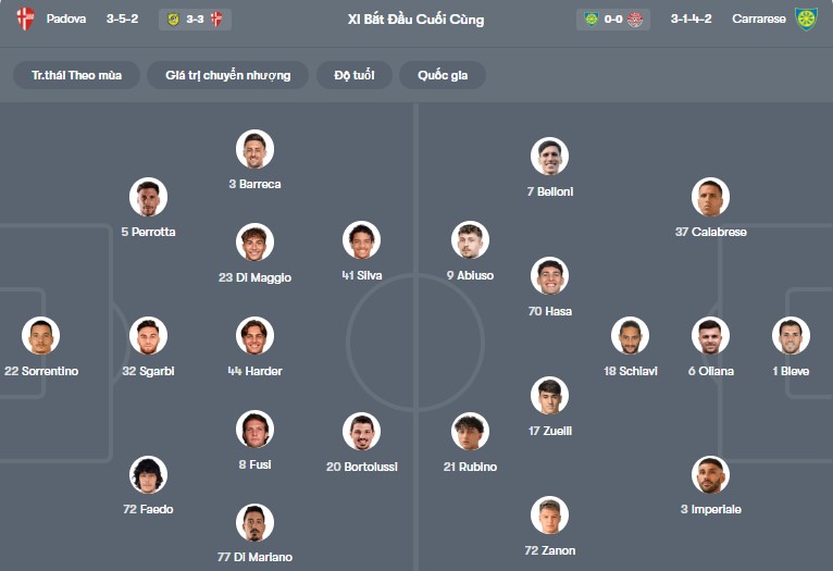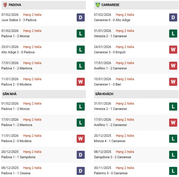 - Padova thắng 1, hòa 1 trong 2 trận gặp Carrarese gần đây.