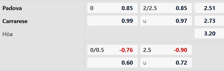 Mức tài xỉu được niêm yết ở mốc 2 1/4 bàn, tương đối phù hợp với xu hướng thi đấu của hai đội. Thống kê cho thấy 5/7 trận sân nhà gần nhất của Padova kết thúc với không quá 2 bàn thắng. Bên phía Carrarese, 2/3 trận gần đây của đội khách cũng có kịch bản khô hạn bàn thắng. Đáng chú ý, cả 2 lần đối đầu gần nhất giữa Padova và Carrarese đều về Xỉu, cho thấy sự thận trọng thường xuyên xuất hiện trong các cuộc chạm trán giữa hai đội.