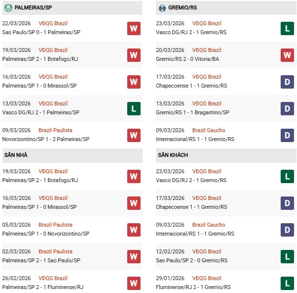 - Trên sân nhà, Palmeiras thắng 7, thua 2 trước Gremio.