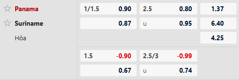 Panama được đánh giá cao hơn ở trận này với mức kèo 1 1/4 bàn. Panama bước vào trận đấu ngày hôm nay với thành tích thua kèo châu Á 3 và hòa 1 ở 4 trận đấu gần đây. Trong khi đó, Suriname chỉ khiến các nhà đầu tư ôm hận ở 1/7 trận vừa qua trên mọi đấu trường, trong đó họ thắng kèo 3 trận và hòa 3 trận.