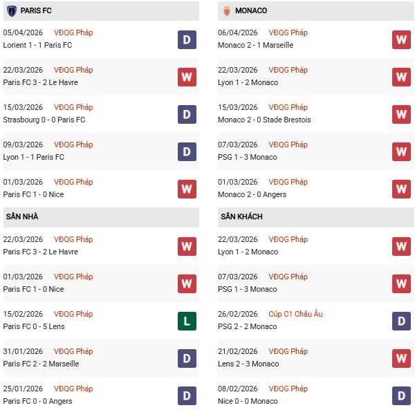 - Paris FC thắng 1, hòa 1 trong 2 trận gặp Monaco gần đây.