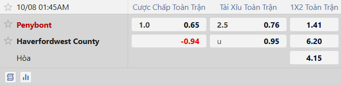 Penybont không phải đội có hàng công quá mạnh và họ chỉ mới ghi 18 bàn mùa này. Tuy nhiên, đội chủ nhà lại có thành tích phòng ngự xuất sắc với chỉ 6 lần phải vào lưới nhặt bóng. Do đó, dễ hiểu khi phần lớn những thắng lợi mà Penybont có được đều là những chiến thắng trắng. Kịch bản tương tự khả năng cao sẽ lặp lại thêm lần nữa trước Haverfordwest khi đội khách chỉ mới có 10 bàn và đã để lọt lưới đến 20 lần. Vậy nên với mức kèo tài xỉu 2 1/2, cơ hội để kèo Xỉu xuất hiện sẽ là rõ ràng hơn rất nhiều.