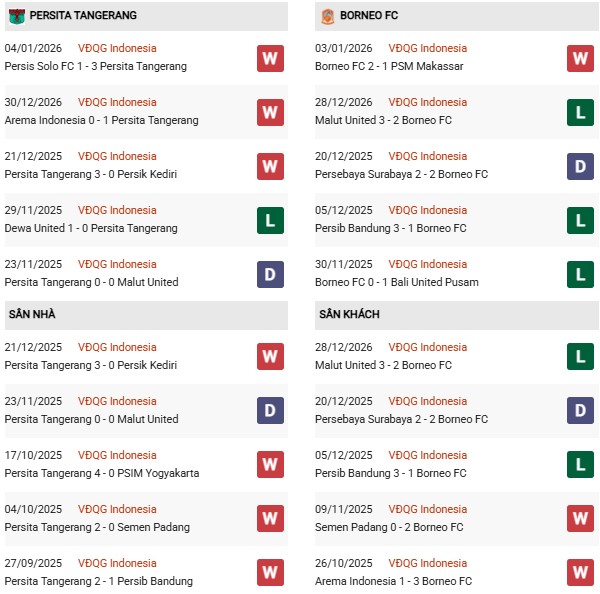 - Persita Tangerang hòa 5, thua 3 trong 8 trận gặp Borneo gần đây.