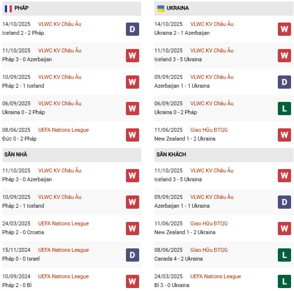 Và, xét về phong độ gần đây thì Pháp vẫn nhỉnh hơn với 4 chiến thắng và 1 trận hòa ở 5 trận gần nhất; còn Ukraine có 2 chiến thắng, 1 trận hòa và 2 thất bại ở 5 trận chính thức vừa qua. Bên cạnh đó, Les Bleus cũng đang duy trì chuỗi 5 trận bất bại trên sân nhà (4 thắng, 1 hòa) nhưng đội bóng áo vàng lại chỉ thắng 1, hòa 1 và thua 2 ở 4 chuyến làm khách gần đây.