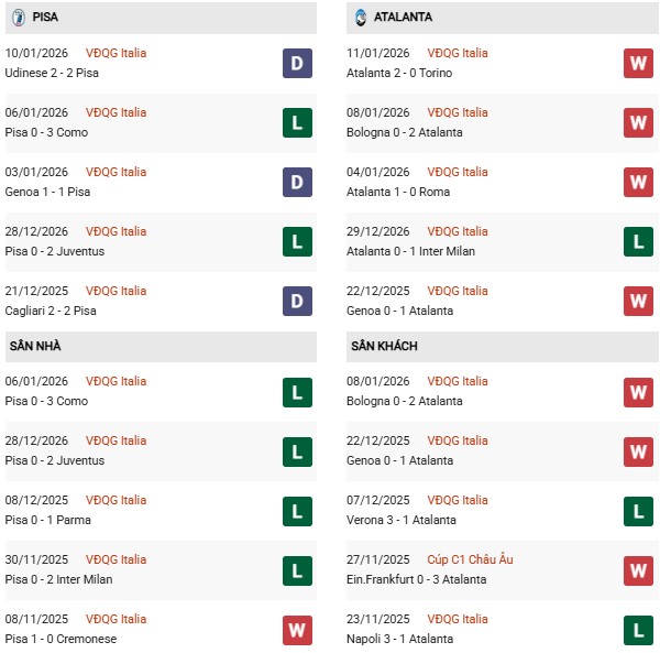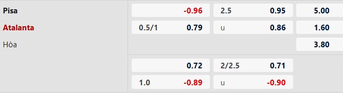 - Pisa hòa 1, thua 2 trong 3 trận đối đầu Atalanta gần đây.