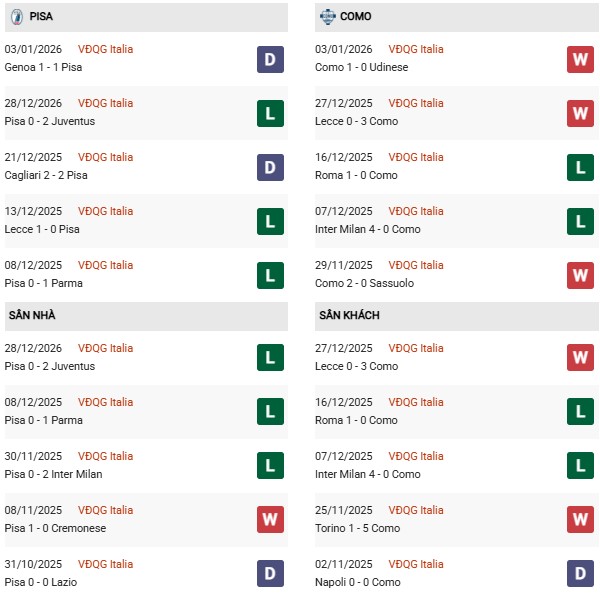 Nên nhớ rằng, phong độ sân khách của Como gần đây cũng không hề tệ. Theo thống kê, trong 13 chuyến hành quân trở lại đây tại các giải đấu chính thức, họ chỉ phải nhận 3 thất bại. Thế nên, không dễ để một đối thủ kém cỏi như Pisa khuất phục được đoàn quân của ông Cesc Fabregas.