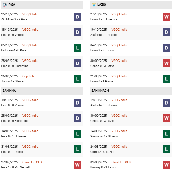 Phong độ của Pisa vs Lazio đang có sự chênh lệch. Trong khi Pisa không thắng 5 trận gần nhất thì Lazio thắng 2/5 trận vừa xong.