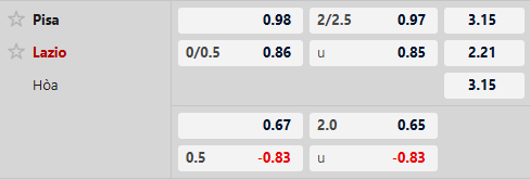 Ít nhất 1 bàn ở hiệp 1: 3/5 trận chính thức gần nhất của Pisa có tối thiểu 1 lần lưới rung hiệp 1. 4/5 trận chính thức vừa xong của Lazio có kịch bản tương tự. NHM nên đợi sau 15 phút đầu thì đặt niềm tin vào nhiều bàn hiệp 1.