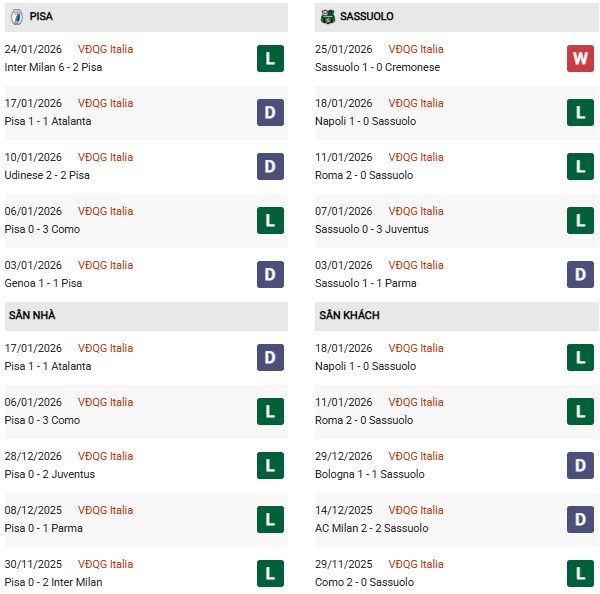- Trên sân nhà, Pisa thắng 2, hòa 1 trước Sassuolo.