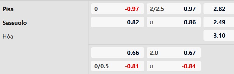 Từ 2 đến 3 bàn: 4/5 trận sân nhà gần đây của Pisa ở Serie A có từ 2 đến 3 bàn, biến cố tương tự cũng xảy ra ở cả 4 trận sân khách gần nhất của Sassuolo với tỷ lệ châu Á dao động từ 0 đến 3/4.