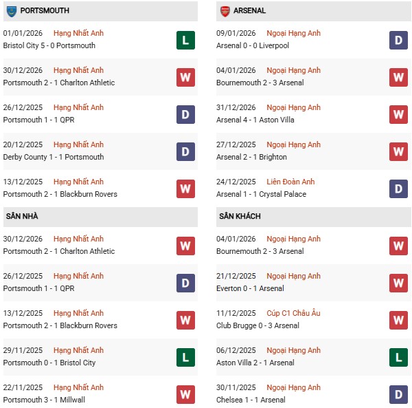 Arsenal đang có chuỗi 5 trận liên tiếp giành chiến thắng trước Portsmouth. Chuỗi thành tích ấn tượng này hứa hẹn sẽ còn kéo dài, do họ đang thắng như chẻ tre, trong khi Portsmouth còn chưa nuốt trôi thất bại cay đắng trước Bristol City ở Championship.