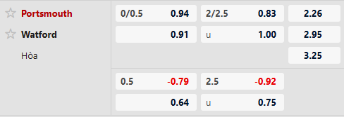 Sàn giao dịch châu Á ghi nhận mức kèo Portsmouth chấp 1/4 trái, tỷ lệ mà đội bóng này rất có duyên khi tiếp đón Watford trên sân nhà với 2 trận gần nhất xuất hiện đều giành chiến thắng. Chưa kể, chiến thắng duy nhất trên sân nhà của Portsmouth từ đầu mùa cũng chứng kiến họ chấp đội khách Preston 1/4 trái như trận này.