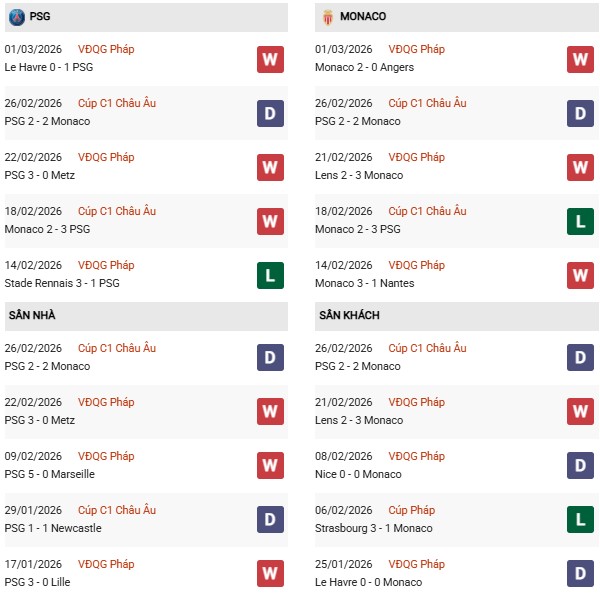 Thống kê phong độ PSG vs Monaco: