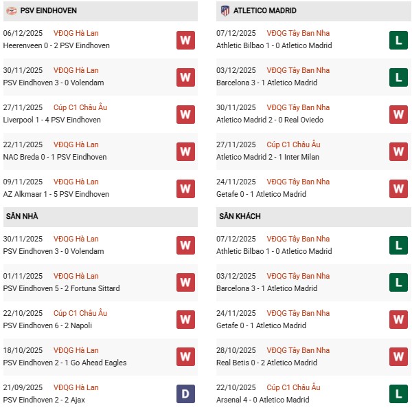 Dự đoán PSV vs Atletico Madrid, 03h00 ngày 10/12, vòng Phân hạng Cúp C1 châu Âu, sân Philips. Với phong độ sân khách khá tệ như thế, rất khó để Atletico Madrid giành thắng lợi trên sân của PSV.