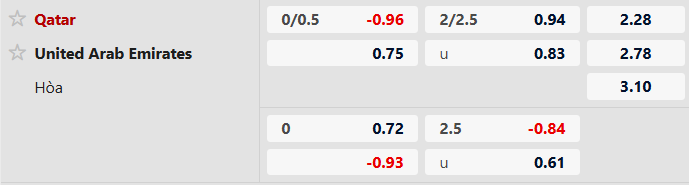 Ưu thế sân nhà cùng dàn cầu thủ từng dự World Cup 2022 là lý do duy nhất giúp Qatar được đánh giá nhỉnh hơn với mức chấp 1/4 bàn. Tuy nhiên, nên nhớ rằng hai đội từng gặp mặt ở vòng loại 3 và Qatar đã toàn thua ở cả 2 lượt trận gặp UAE. Rõ ràng với phong độ cực kỳ xuất sắc giai đoạn vừa qua, UAE đủ sức giành được ít nhất 1 trận hòa trước Qatar và thắng luôn kèo đấu châu Á.