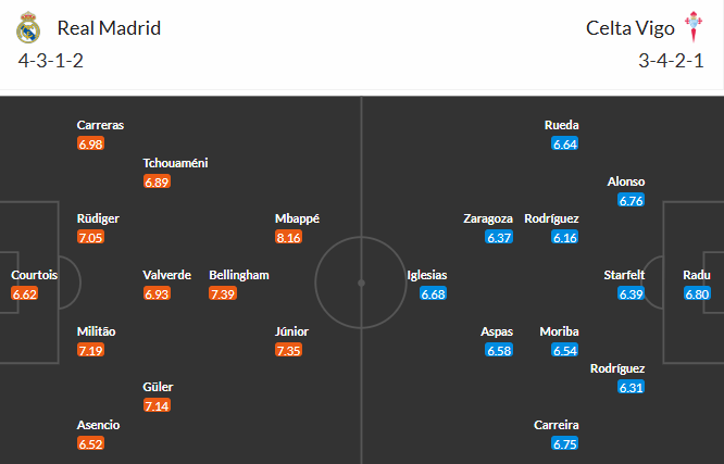 Cũng trên sân nhà, Real Madrid luôn át vía Celta Vigo trong quá khứ. Những con số thống kê không hề biết nói dối. Theo đó, đội bóng thủ đô Madrid đánh bại đối thủ này ở 12/13 lần tiếp đón tại Bernabeu gần đây, và 1 trận còn lại kết thúc với tỉ số bất phân thắng bại. Trong đó, ở chiến thắng 3-2 tại lượt về La Liga mùa trước, tiền đạo Mbappe lập cú đúp vào lưới của đội khách Celta Vigo.