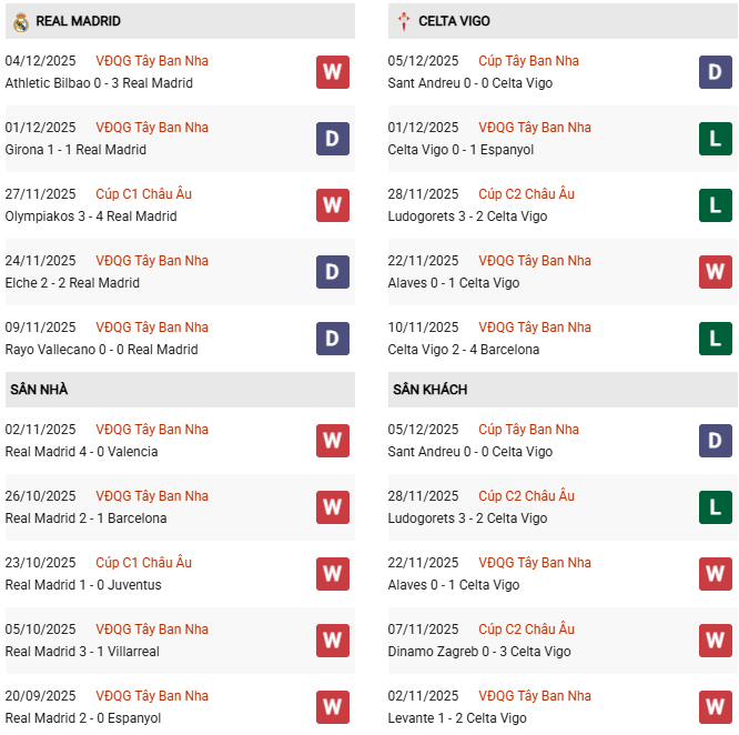 - Trên sân nhà, Real Madrid thắng 7, thua 1 trước Celta Vigo.
