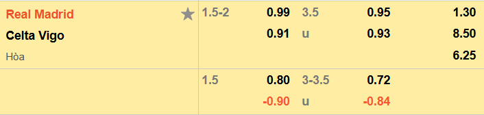 Tối đa 1 bàn hiệp 1: 5/6 lần gặp giữa 2 đội gần đây tại các giải chính thức chỉ có nhiều nhất 1 bàn thắng trong hiệp 1. 3/4 trận gần đây của Real Madrid ở La Liga và 4 trận mới nhất của Celta Vigo tương tự.