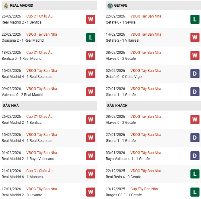 Đội bóng của Alvaro Arbeloa có thành tích sân nhà tốt thứ 3 tại La Liga mùa này khi giành được 33 điểm sau 12 trận. Chiều ngược lại, Getafe lại chỉ thắng 3/10 trận sân khách gần nhất, tính trong 90 phút. Hơn nữa, Real có thành tích đối đầu cực kỳ ấn tượng với Getafe khi giành chiến thắng ở 31/41 trận đấu gần nhất giữa hai đội trên mọi đấu trường. Nếu chỉ tính giai đoạn gần đây thì Getafe thua cả 8 trận gần nhất gặp Real Madrid.