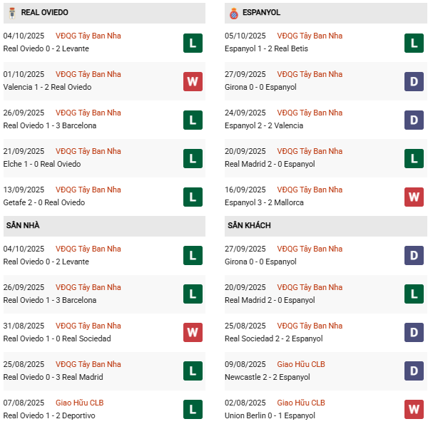 - Real Oviedo thắng 2, hòa 1, thua 4 trong 7 trận gặp Espanyol gần đây.