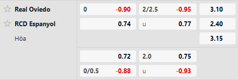 Real Oviedo đang là đội có hàng công tệ nhất La Liga mùa này khi chỉ mới ghi vỏn vẹn 4 bàn sau 8 trận. Trái lại, những trận cầu có sự xuất hiện của Espanyol lại có khá nhiều bàn thắng được ghi bởi đội khách đã có cho mình 11 pha lập công cũng như 11 lần phải vào lưới nhặt bóng. Có đến 5/7 trận đấu gần nhất giữa hai đội đều đã về kèo Xỉu chung cuộc và khả năng cao kịch bản này sẽ lặp lại thêm lần nữa khi tỷ lệ tài xỉu ở mức 2 1/4.