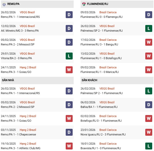 Phong độ tổng thể của Fluminense vẫn rất tích cực khi thắng 6, hòa 3 và chỉ thua 1 trong 10 trận gần nhất trên mọi đấu trường. Tuy nhiên, thành tích sân khách của họ lại chưa thực sự thuyết phục khi chỉ thắng 2, hòa 3 và thua 5 trong 10 chuyến xa nhà gần đây. Điều này có thể khiến Fluminense gặp không ít khó khăn trước một Remo chơi khá chắc chắn trên sân nhà.
