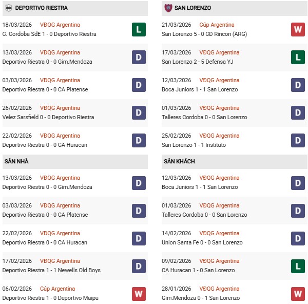 - Trên sân nhà, Riestra thắng 1, hòa 1 trước San Lorenzo.