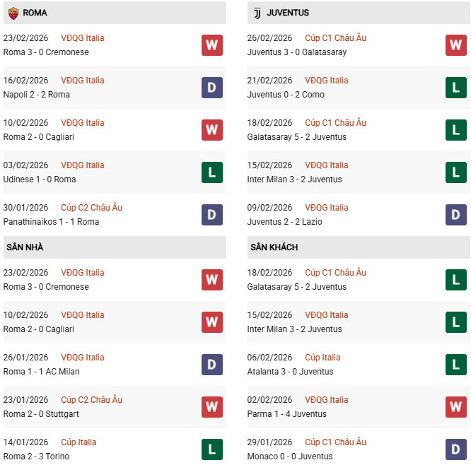 - Trên sân nhà, Roma thắng 3, thua 2 trước Juventus.