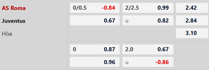 Lưới rung hiệp 1: 11/14 trận đụng độ gần nhất, 2/3 trận gần đây của Roma và cả 7 trận vừa qua của Juventus đều có ít nhất 1 lần lưới rung hiệp 1. Hơn nữa, 5/6 cuộc chạm trán gần đây tại sân Olimpico cũng đều có tối thiểu 1 bàn trong hiệp 1.