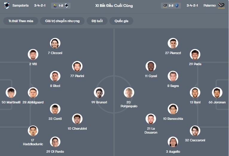Số liệu thống kê Sampdoria gặp Palermo: