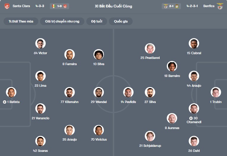 - Trên sân nhà, Santa Clara hòa 2, thua 6 trước Benfica.