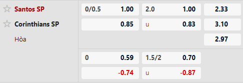 Santos chấp 1/4 bàn cho cả trận. Santos đã trải qua 3 thất bại liên tiếp và chỉ biết hòa hoặc thua trong 4 trận gần nhất tại Urbano Caldeira. Ở chiều ngược lại, Corinthians lại đang cho thấy sự ổn định hơn hẳn khi bất bại 4/5 chuyến hành quân gần đây. Không chỉ vậy, lịch sử đối đầu giữa hai đội trong những mùa gần đây cũng đang nghiêng về phía đội khách. Lựa chọn Corinthians ở kèo dưới là an toàn hơn.