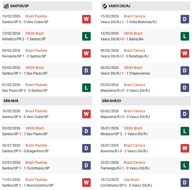 Về phần mình, Santos lại tỏ ra rất có duyên trên sân nhà. Bằng chứng là họ đang có chuỗi 9 trận bất bại liên tiếp khi tiếp đón các đối thủ (thắng 5, hòa 4). Đáng chú ý, ở trận sân nhà gần nhất, Santos đã đè bẹp AE Velo Clube SP tới 6 bàn không gỡ. Với màn thị uy ấn tượng như vậy, rất có thể họ sẽ khiến Vasco da Gama phải nhận kết cục buồn.