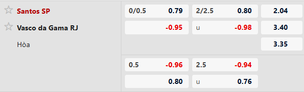 Tỷ số lẻ: 4/5 trận gần đây giữa Santos và Vasco da Gama kết thúc với tỷ số lẻ. 3/4 trận vừa qua của Santos cũng diễn ra theo kịch bản tương tự.