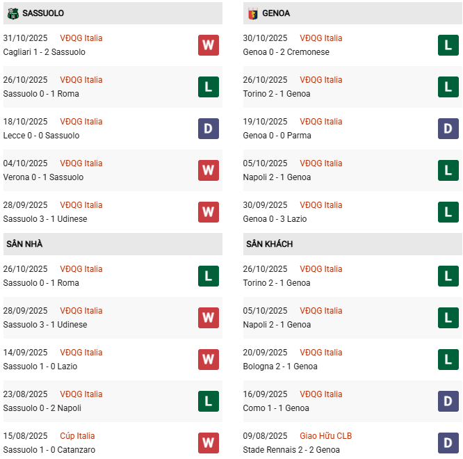 Đội bóng của Fabio Grosso hiện đang đứng thứ 10 sau 9 trận. Sassuolo giờ đây sẽ trở về Reggio Emilia, nơi họ đã thắng 2 và thua 2 trận cho đến nay. Tính đến thời điểm này, Sassuolo chỉ thua 2 trong số 10 trận sân nhà ở Serie A trước Genoa, thắng hơn một nửa số trận, và phong độ hiện tại báo hiệu họ mới là cửa trên.