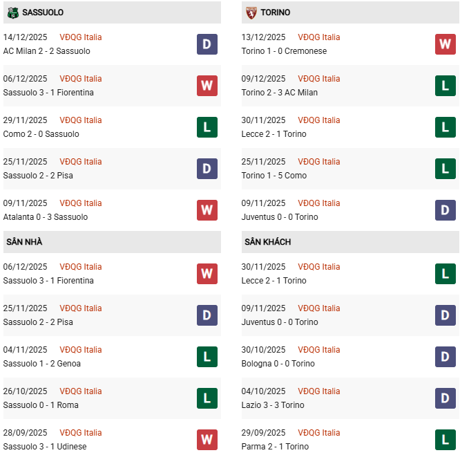 - Trên sân nhà, Sassuolo thắng 1, thua 1 trước Torino.