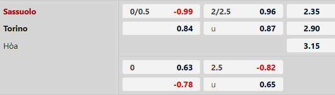 Tối thiểu 3 bàn thắng: 6/7 trận gần đây của Sassuolo chỉ xuất hiện nhiều nhất 3 bàn thắng. 3/4 trận vừa qua của Torino xảy ra tình trạng tương tự.