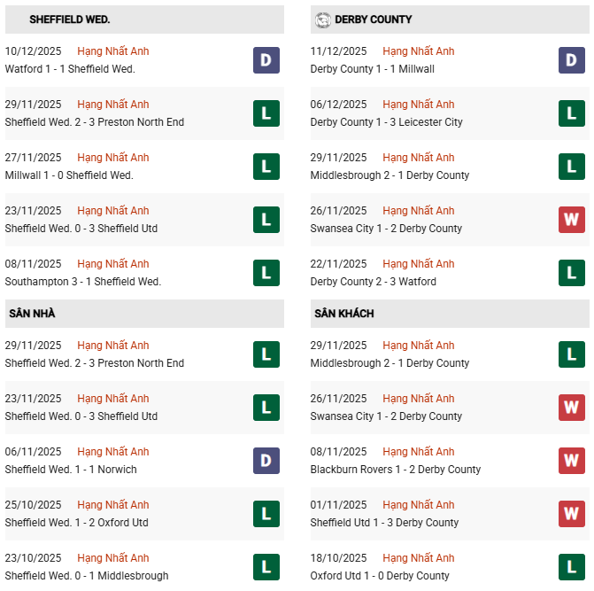 - 10 lần gần nhất gặp nhau, Sheffield Wed thắng 4 thua 2 và hòa 4 trước Derby County.
